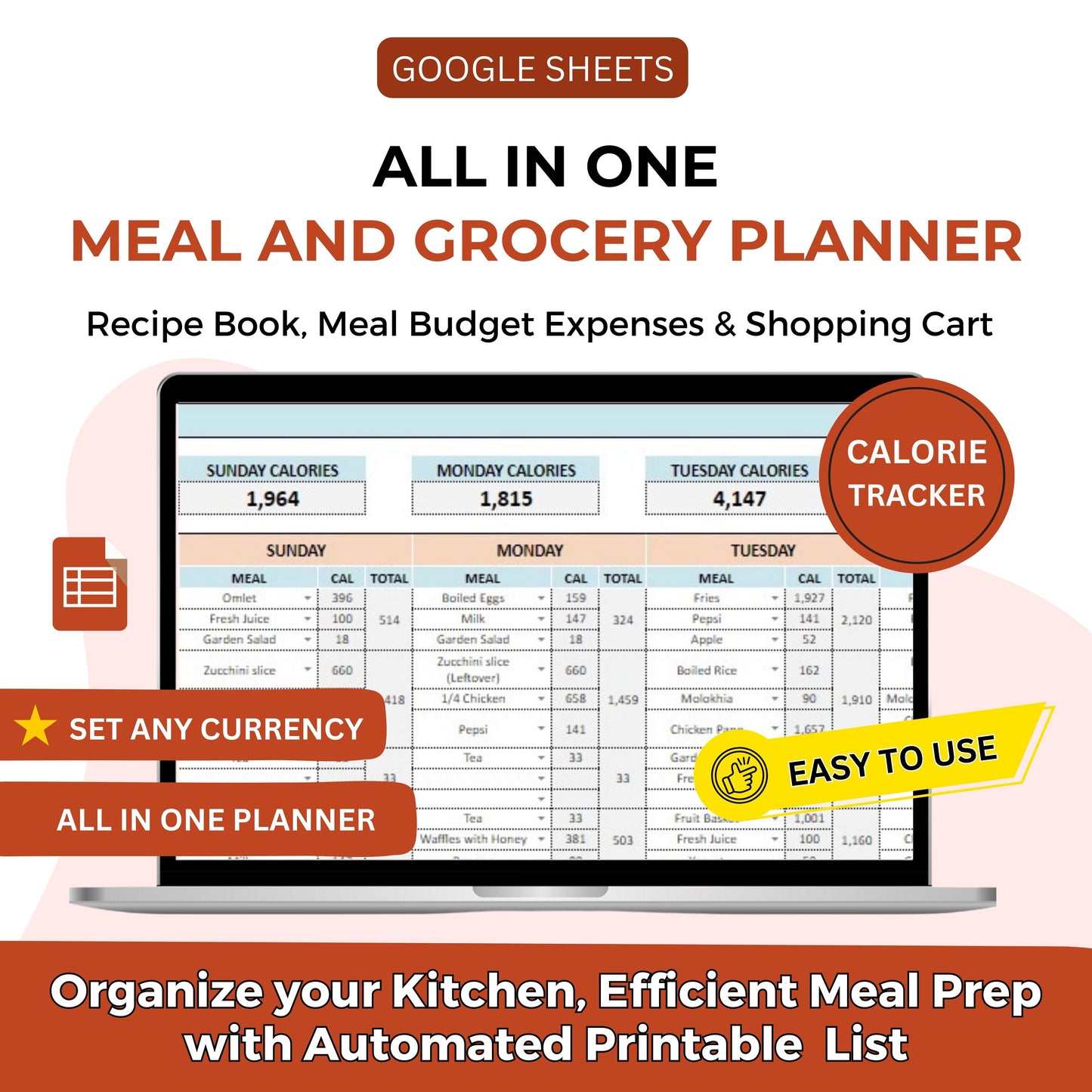 ⢠MEAL AND GROCERY PLANNER - Get ready to make meal planning super easy with this special Weekly Meal Planner for Google Sheets. It's like your personal chef assistant!