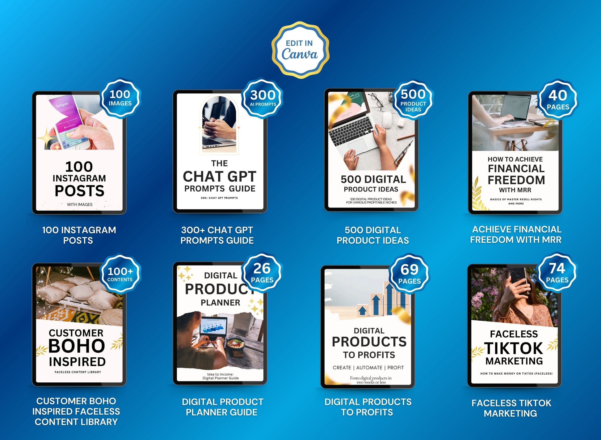 • 500 Digital Product Ideas – An inspiring list of profitable ideas to kickstart your online business and diversify your income streams.