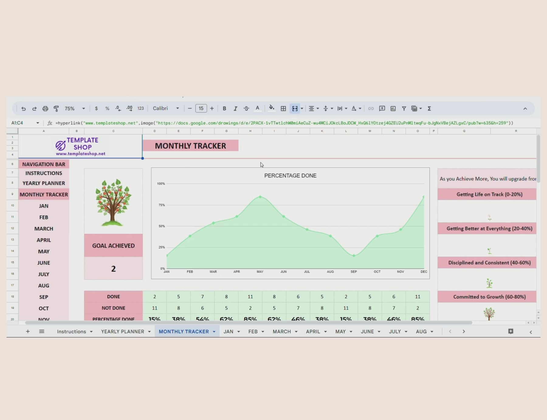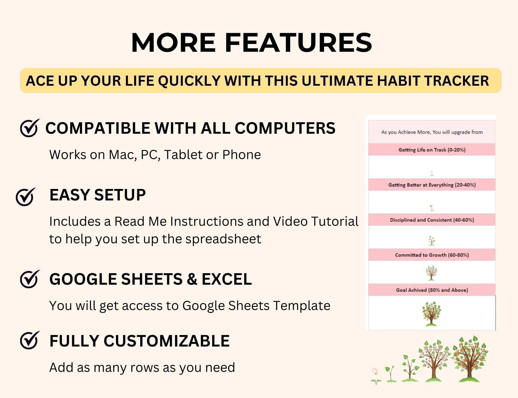 Start growing good habits with our simple Habit Tracker template! It's designed to be beautiful and easy to use. The idea is to "plant a TREE each day" by checking off your daily habits. As you keep up with your habits, you'll see your sapling grow into a rose! How many rose can you grow in a month? That's a fun way to track your progress. This template combines a yearly habit planner, monthly habit tracker, weekly habit tracker, and daily habit tracker all in one. You can also use it as a goal tracker, daily checklist, or to-do list for your routine tasks. No matter what you want to achieve, like better health or work-life balance, this digital planner can support you every step of the way.