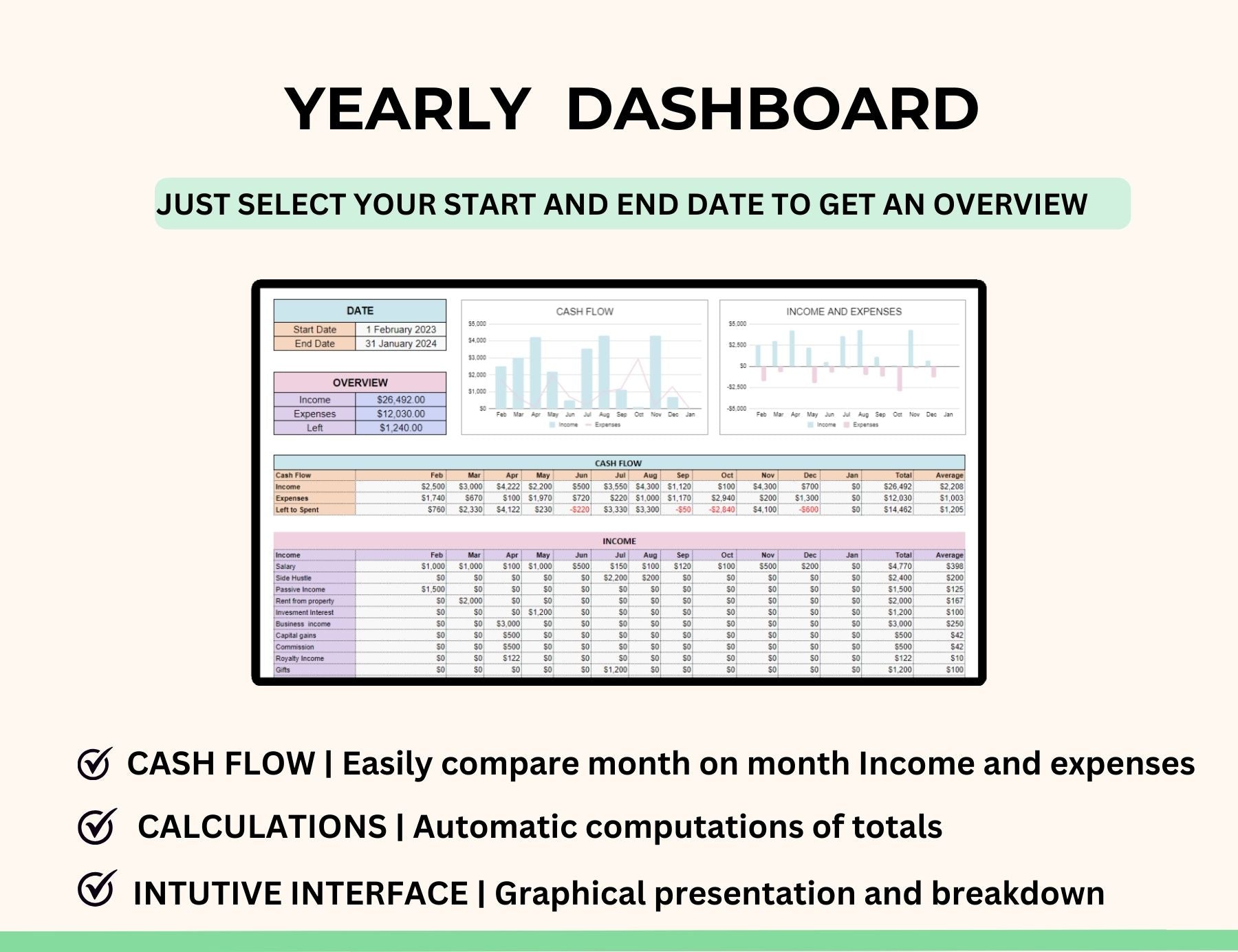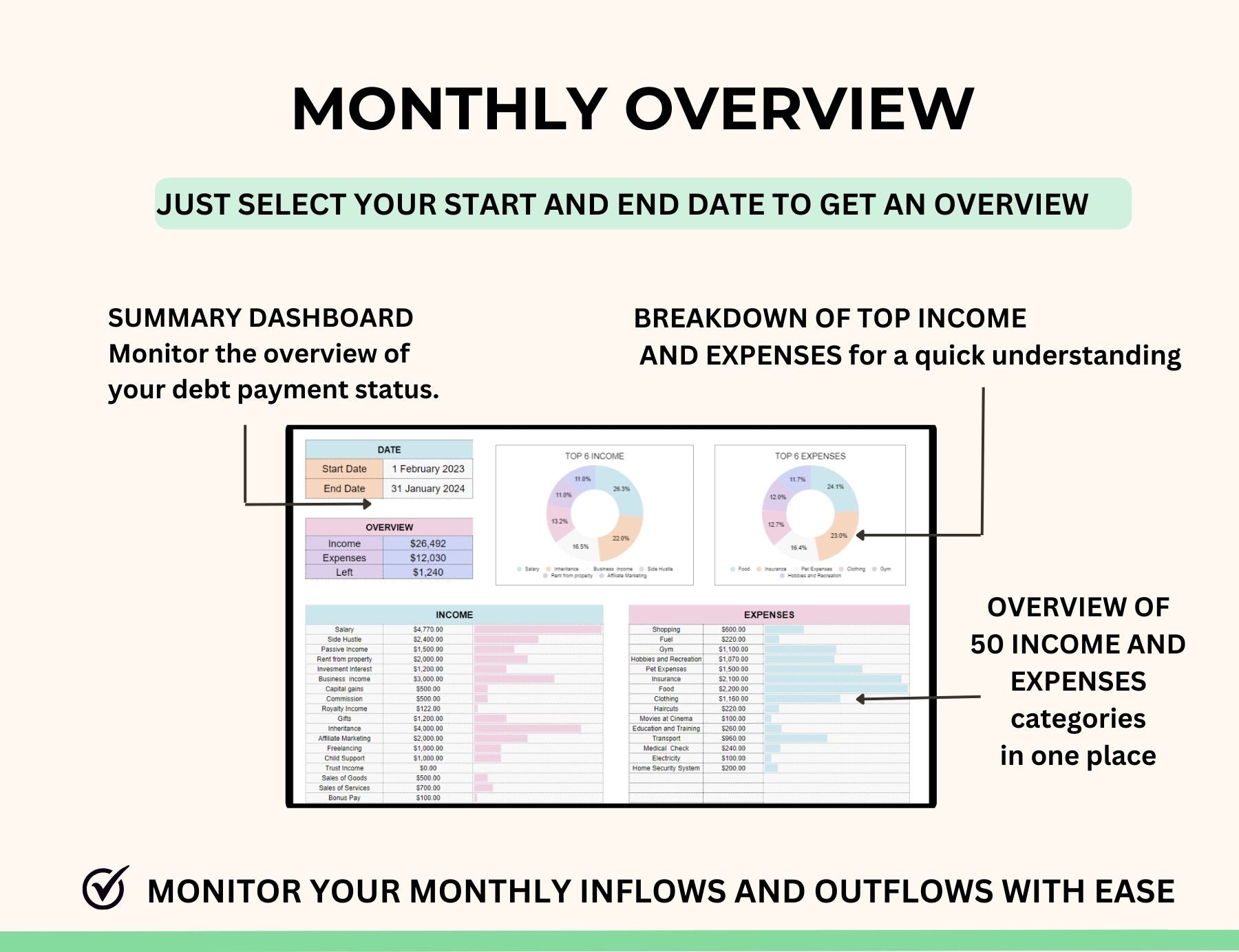 ⢠ INCOME AND EXPENSE DASHBOARD - Monitor your monthly inflows and outflows with ease.  Create up to 50 income and expense categories for accurate tracking.