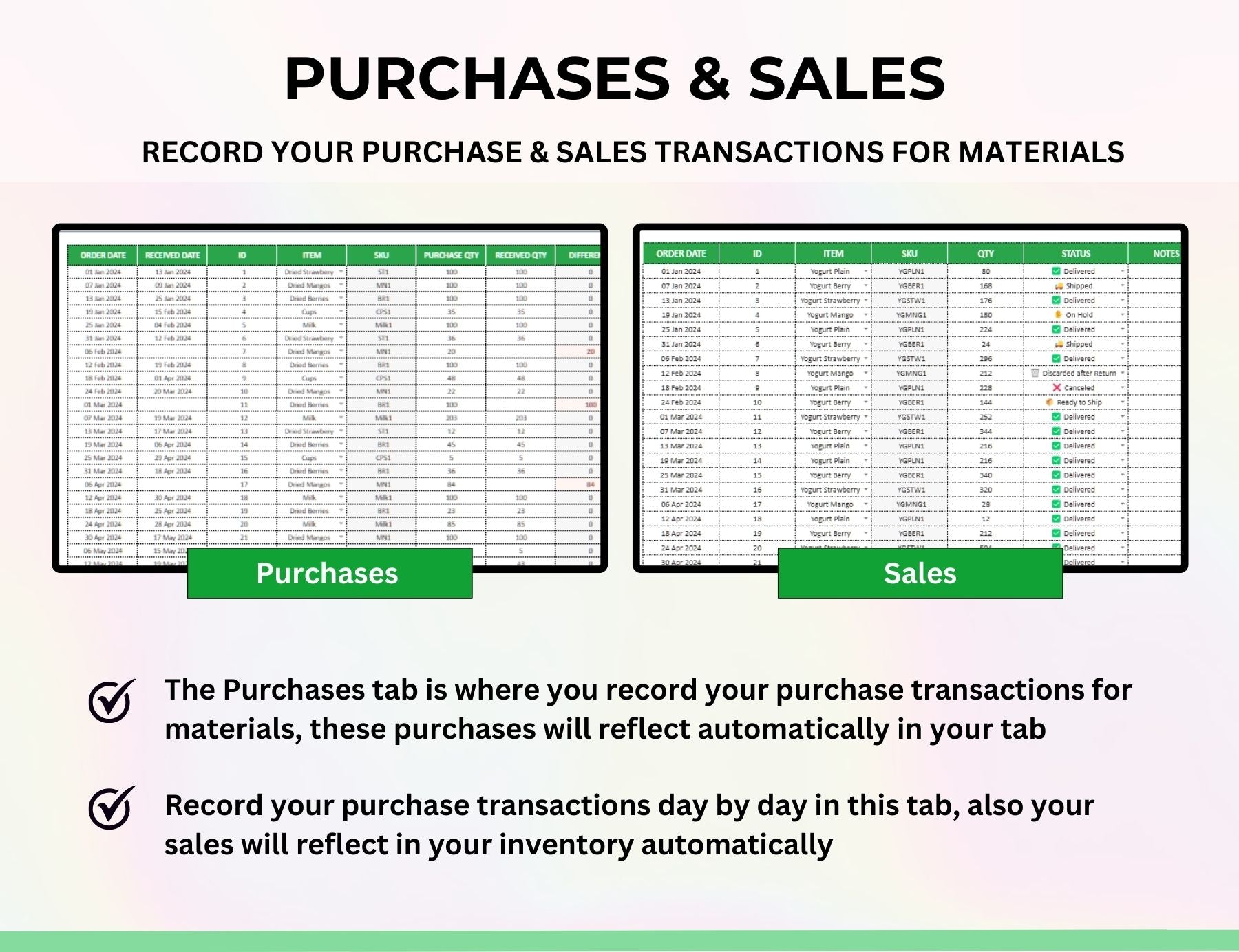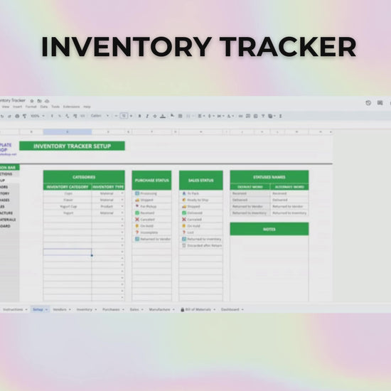 Efficiently manage your inventory and ensure items are always well-stocked with this inventory tracker spreadsheet. Easily track your purchases to prevent duplicate orders. Monitor sales transactions from "To Pack" to "Delivered." Quickly update product and material usage for manufacturing. Get a complete overview of your inventory, purchases, sales, and vendors with the fully automated Inventory Dashboard. It's simple, intuitive, and visually appealing, containing only the essentials. Just enter your transactions, and everything else is calculated for you automatically!