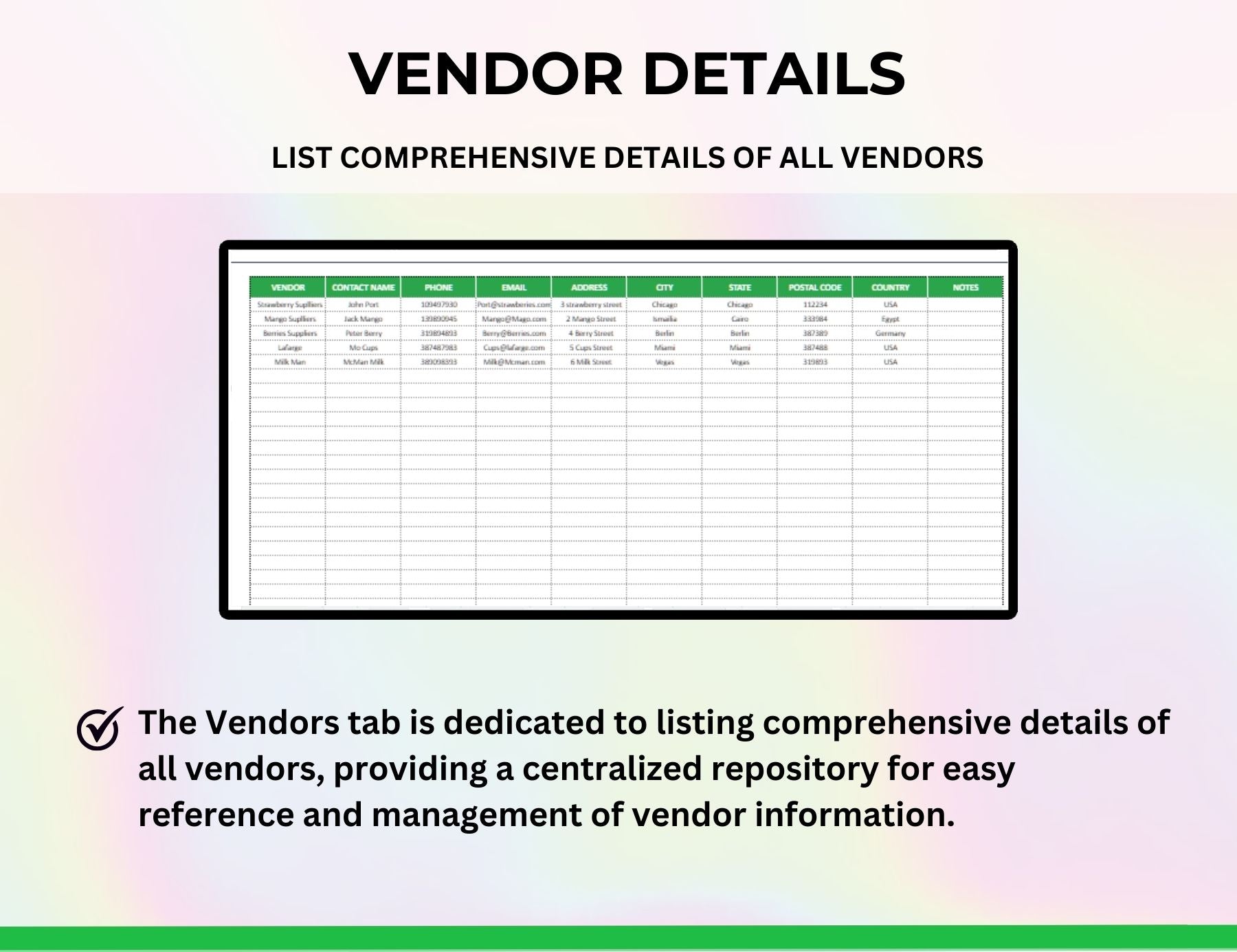 ⨠VENDOR LIST - The Vendors tab is dedicated to listing comprehensive details of all vendors, providing a centralized repository for easy reference and management of vendor information. Efficiently track vendor contacts.