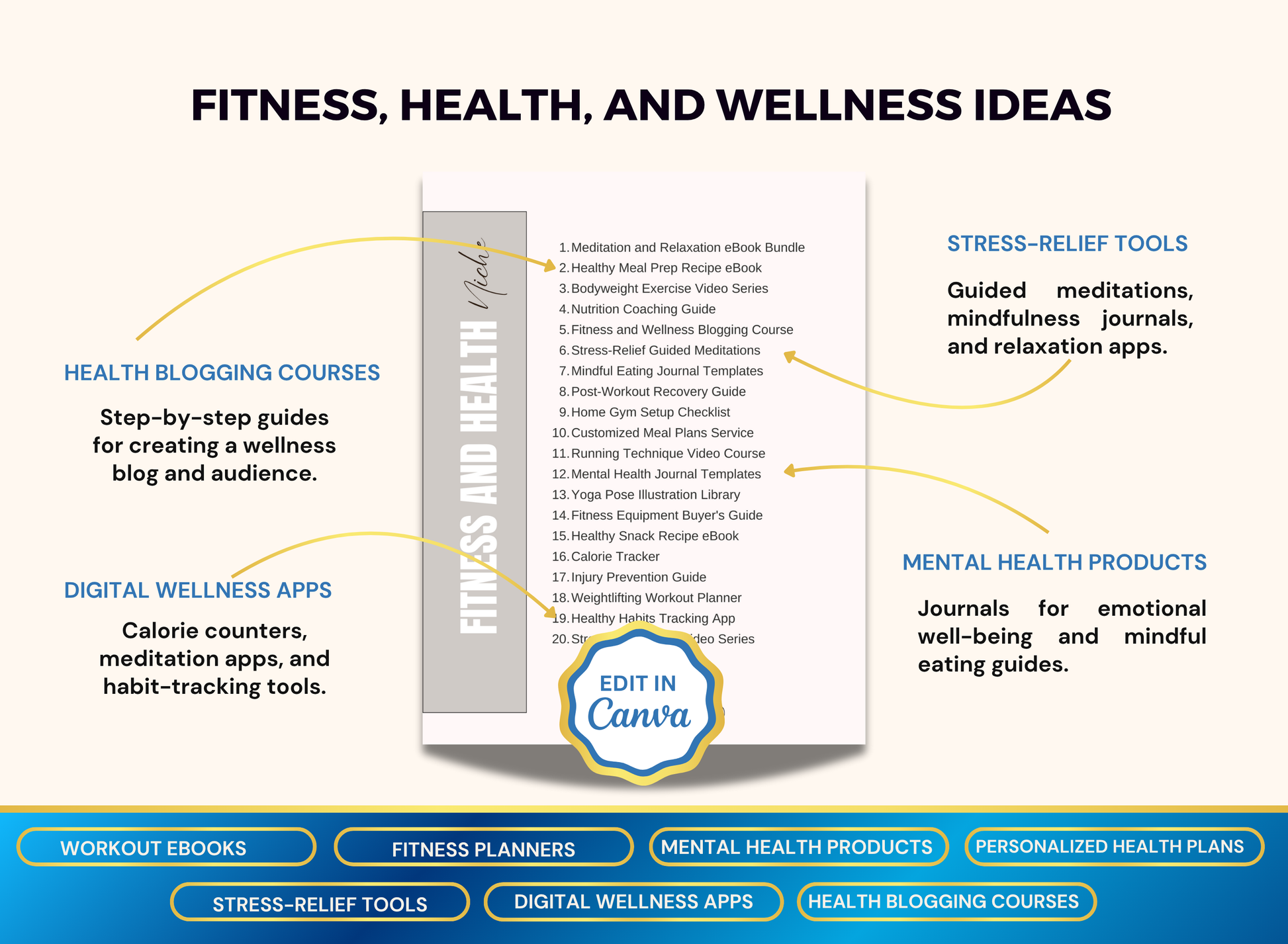 ✅Fitness, Health, and Wellness Ideas (Health blogging courses, digital wellness apps, stress-relief tools, mental health products)