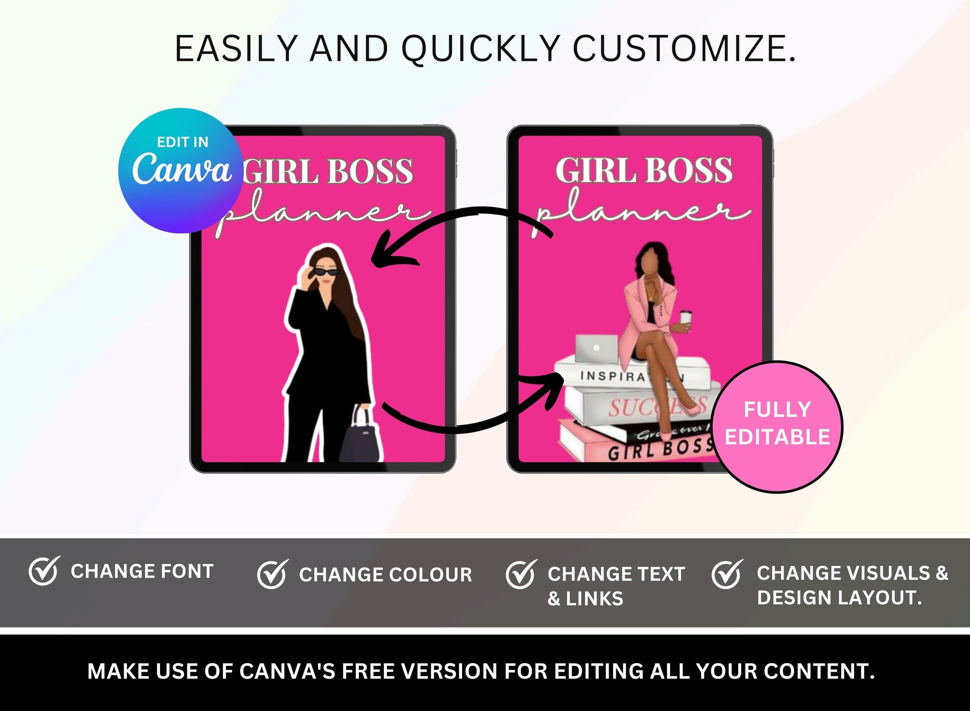 Introducing the MRR PLR DONE FOR YOU GIRL BOSS Hyperlinked Planner with full resale rights. It also includes the editable Canva Template so you can edit colors, fonts, and layouts, making it unique for your customers. With a commercial use license, you can market and distribute this digital product as your own, making passive income for yourself. Invest in this Digital Bundle Planner and make a profit.