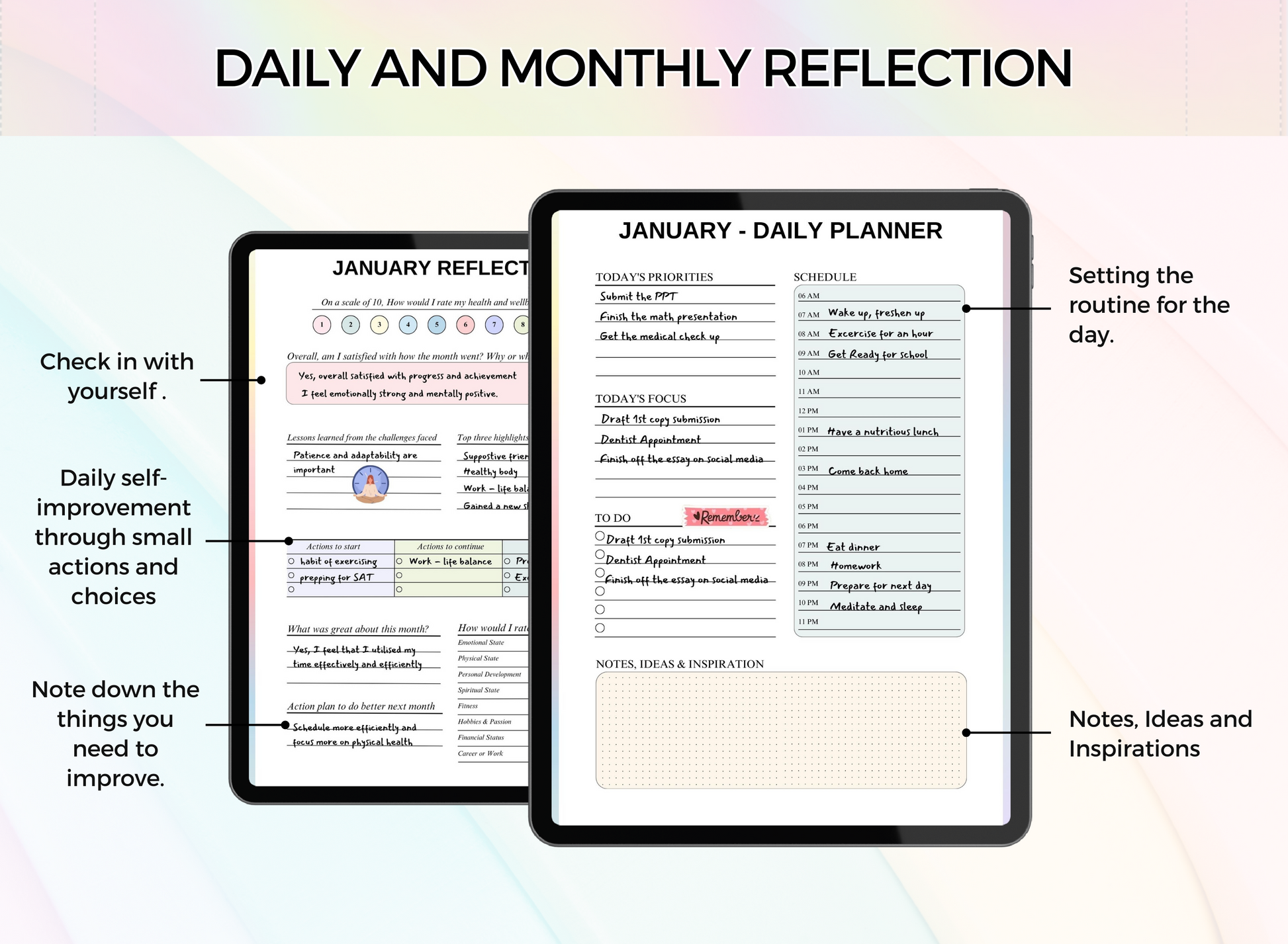 This planner has been created with care to boost your productivity, guide you to conquer your goals, and lead you towards a balanced life. This unique planner, despite its vintage charm, features a blend of creativity and practicality. It's supported by an intricate system of hyperlinks and buttons, ensuring a seamless user experience. Whether you're aiming for goals, monitoring your lifestyle, or seeking organization, this planner Bundle is your perfect companion!