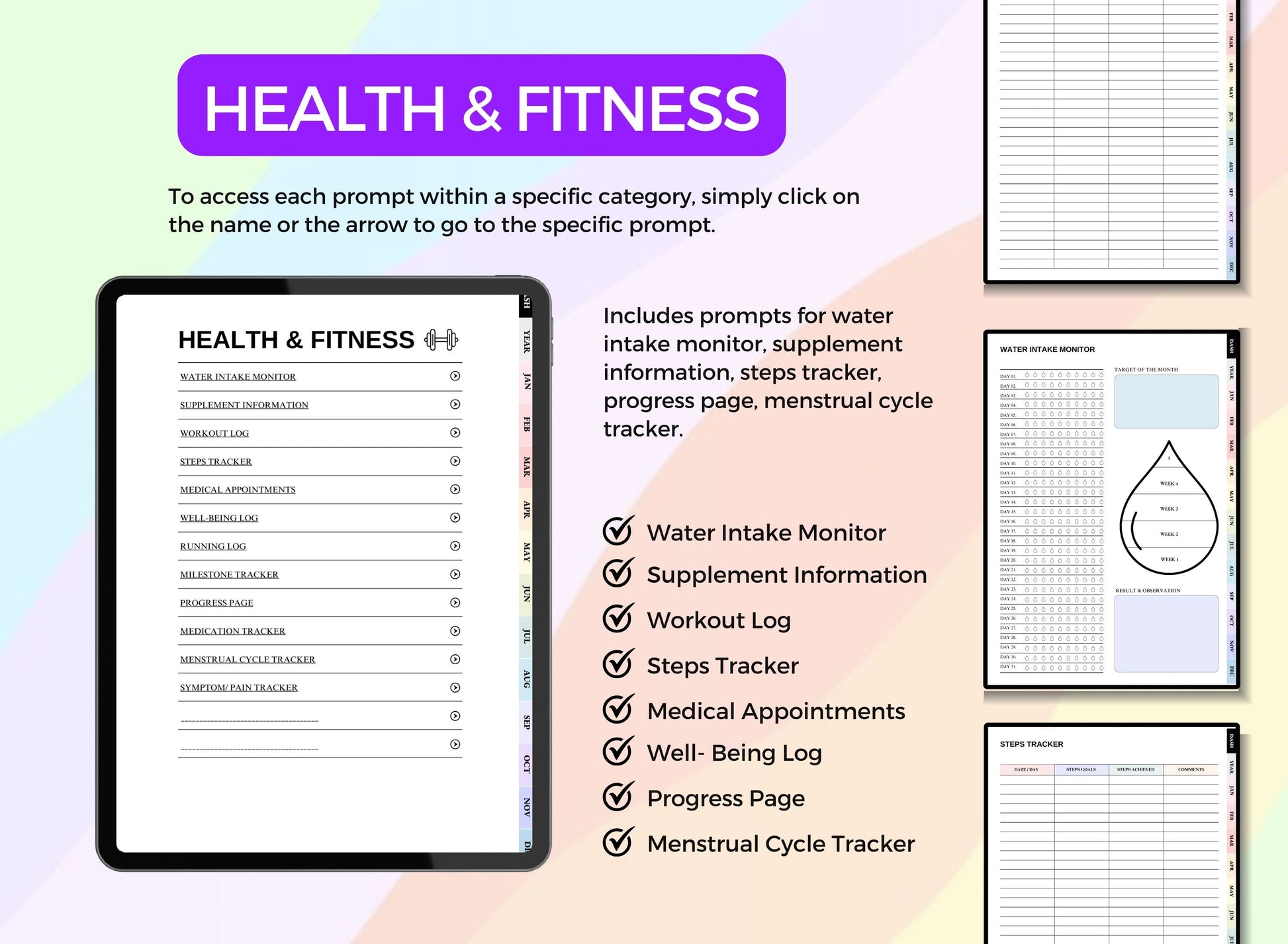 Symptom tracking / Medical appointments / Habit monitoring / Monthly sleep patterns / Hydration progress / Mood tracking / Pain journal / Period cycle tracking / medication log