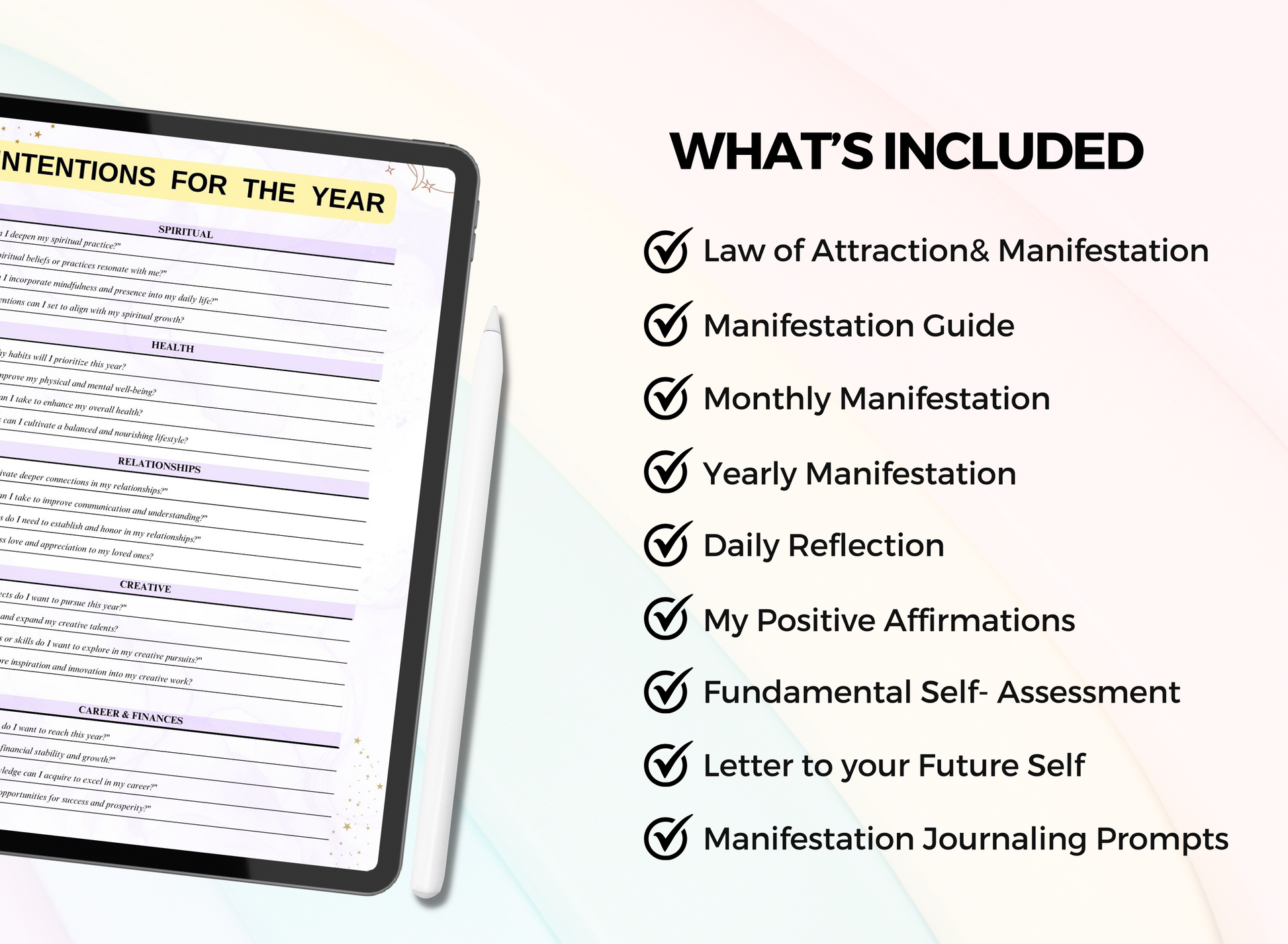 Create your dream life using this special digital planner that works with Manifestation and Law of Attraction! Plan your days, weeks, and months with positive intentions and daily affirmations to help you bring your dreams to life. This planner is designed to help you attract and make real the life you've always wanted.