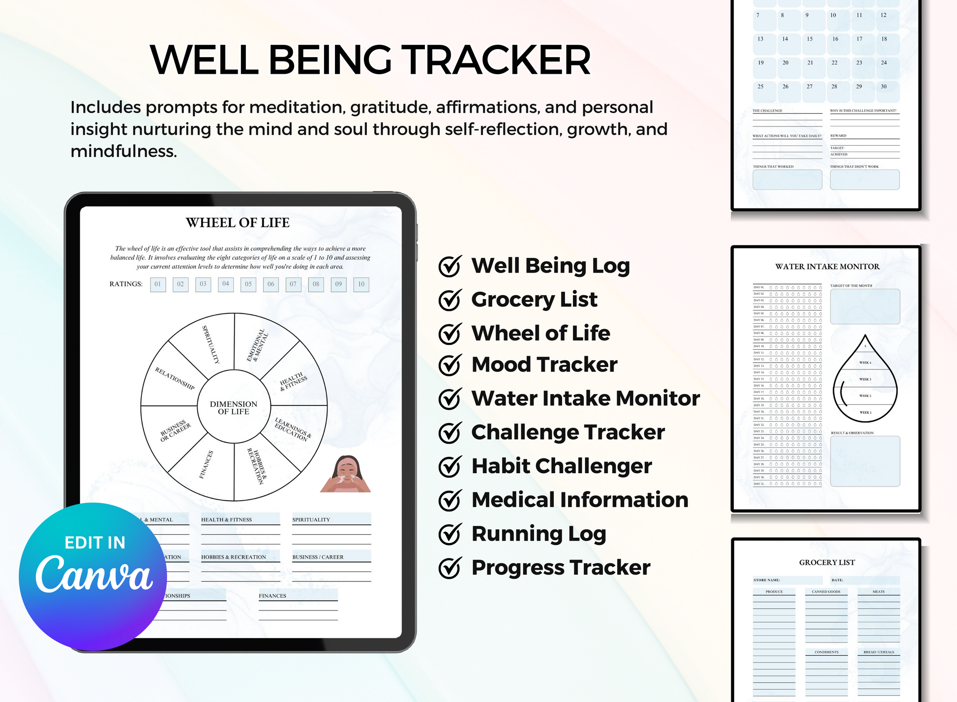 Taking care of your mental and physical health is truly a challenge in the midst of our busy lives. Often, we tend to overlook the importance of health and wellness. That's where our Editable Wellness Journal steps in, offering you a warm and supportive companion on your journey. It's thoughtfully designed to guide you towards a deeper mindfulness of your body and mind. With daily entries, affirmations, gratitude, wellness goals, self-care rituals, and tracking for nutrition, exercise, and sleep, this journal becomes a powerful tool for self-reflection and understanding patterns that impact your overall well-being. Best for coaches, mental health enthusiasts, marketers, agency owners, digital product resellers, Etsy shop owners
