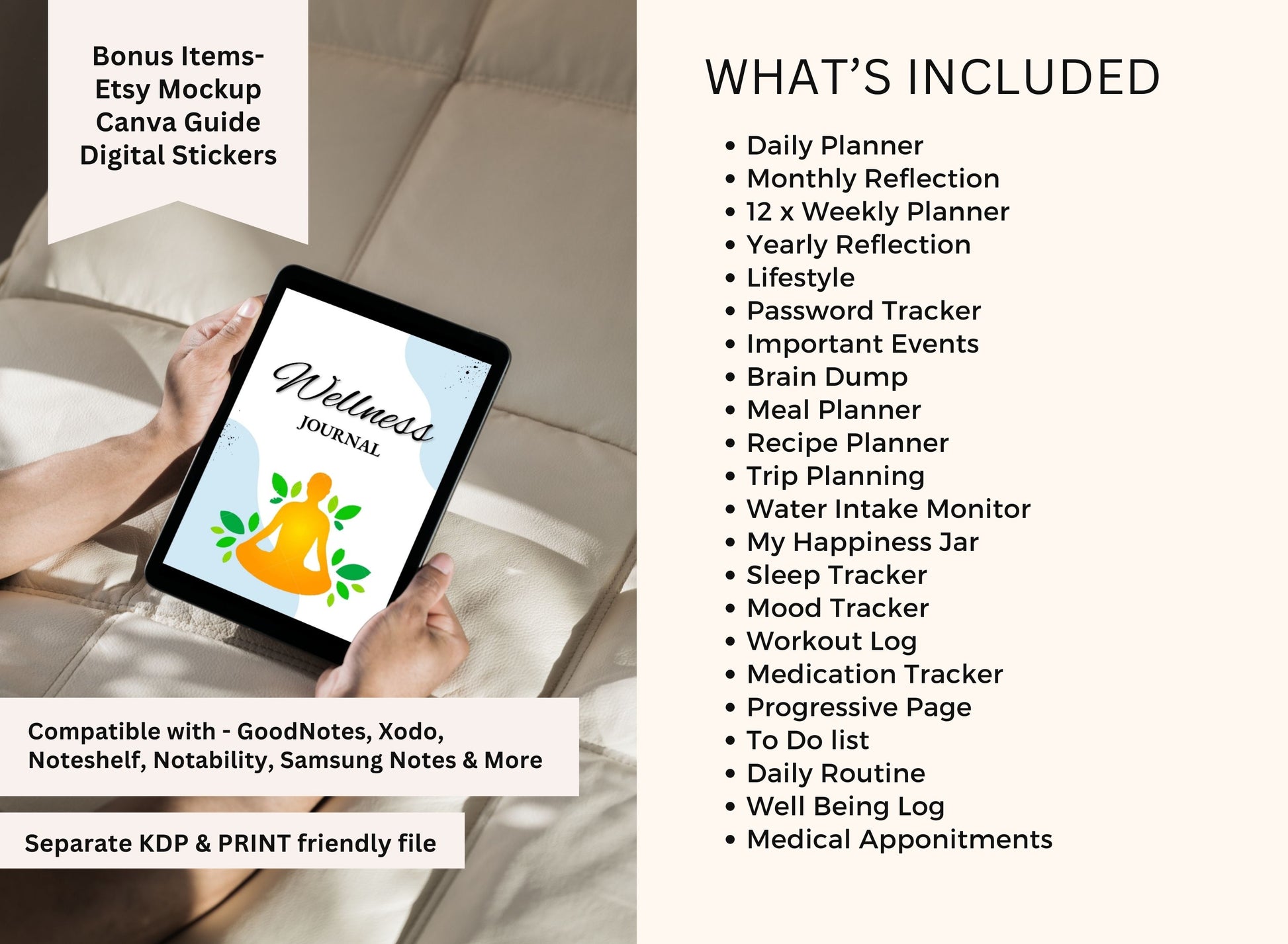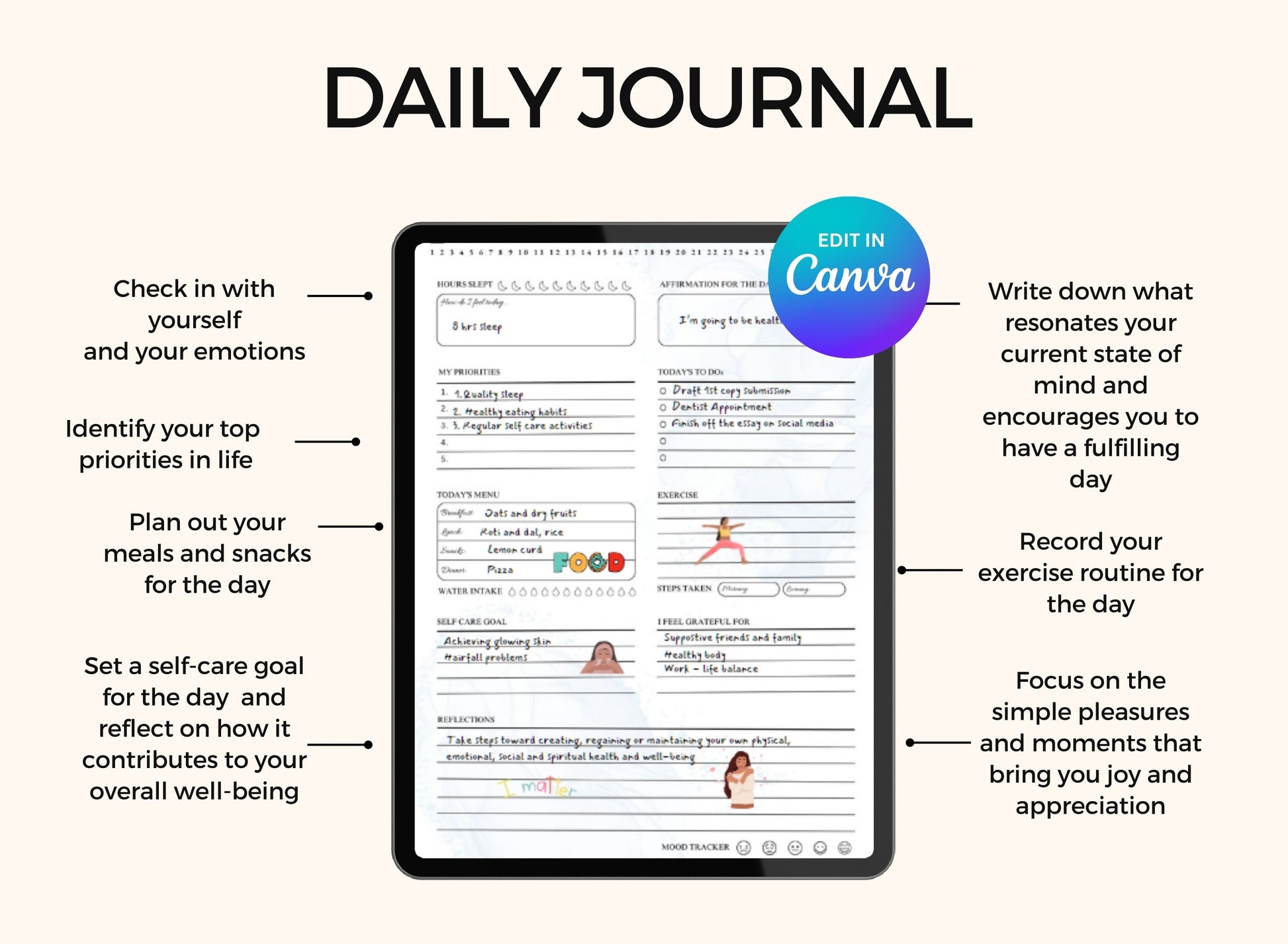 With daily entries, affirmations, gratitude, wellness goals, self-care rituals, and tracking for nutrition, exercise, and sleep, this journal becomes a powerful tool for self-reflection and understanding patterns that impact your overall well-being. Best for coaches, mental health enthusiasts, marketers, agency owners, digital product resellers, Etsy shop owners
