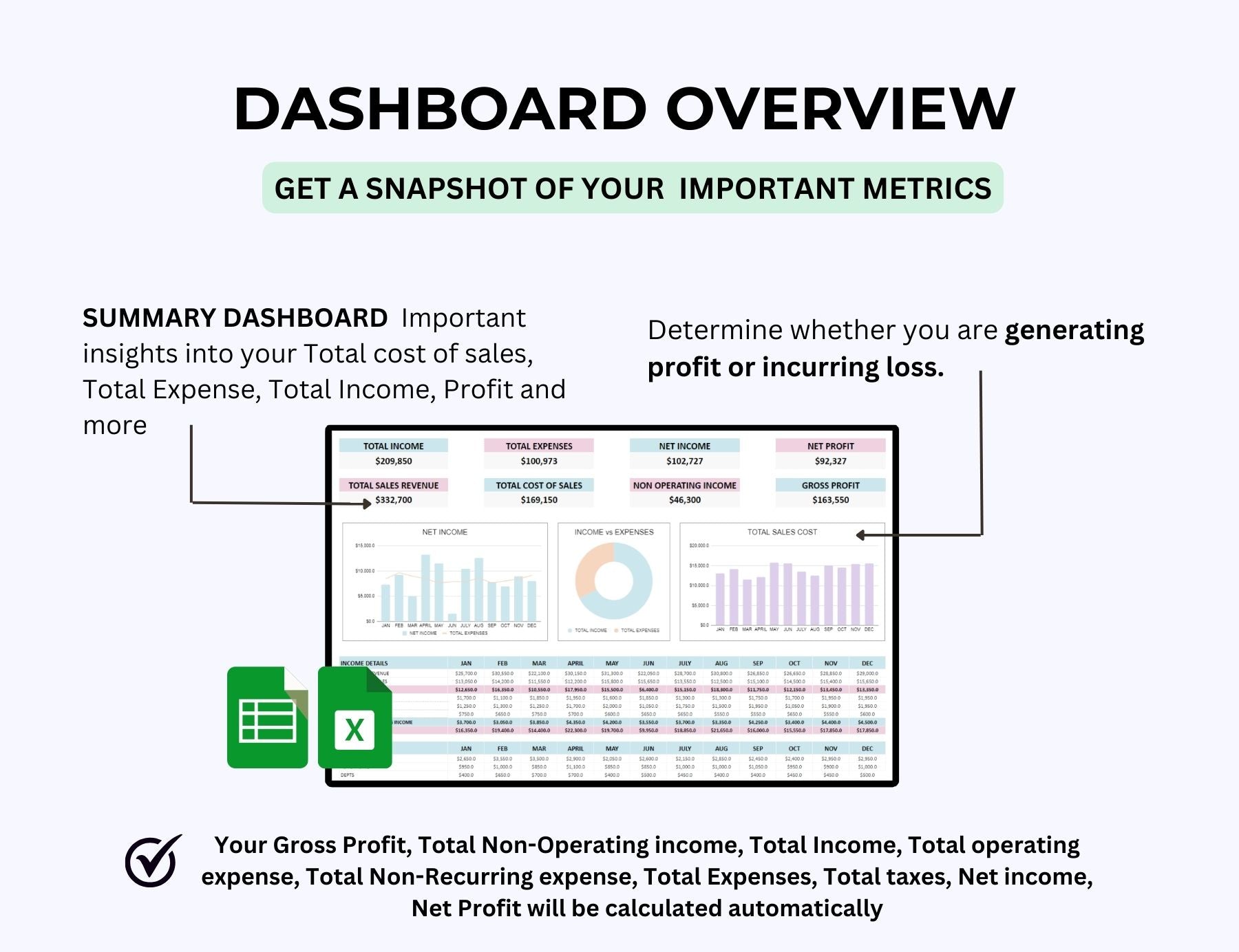 ⢠PROFIT AND LOSS DASHBOARD - Dashboard gives you a snapshot of your annual income, expense and profit alongside other key data. By having a glance at the automated graphs you can easily decipher important insights into your Total cost of sales, the performance of Total Expense and Total Income and also the distribution of Net Profit along the different months of the year.