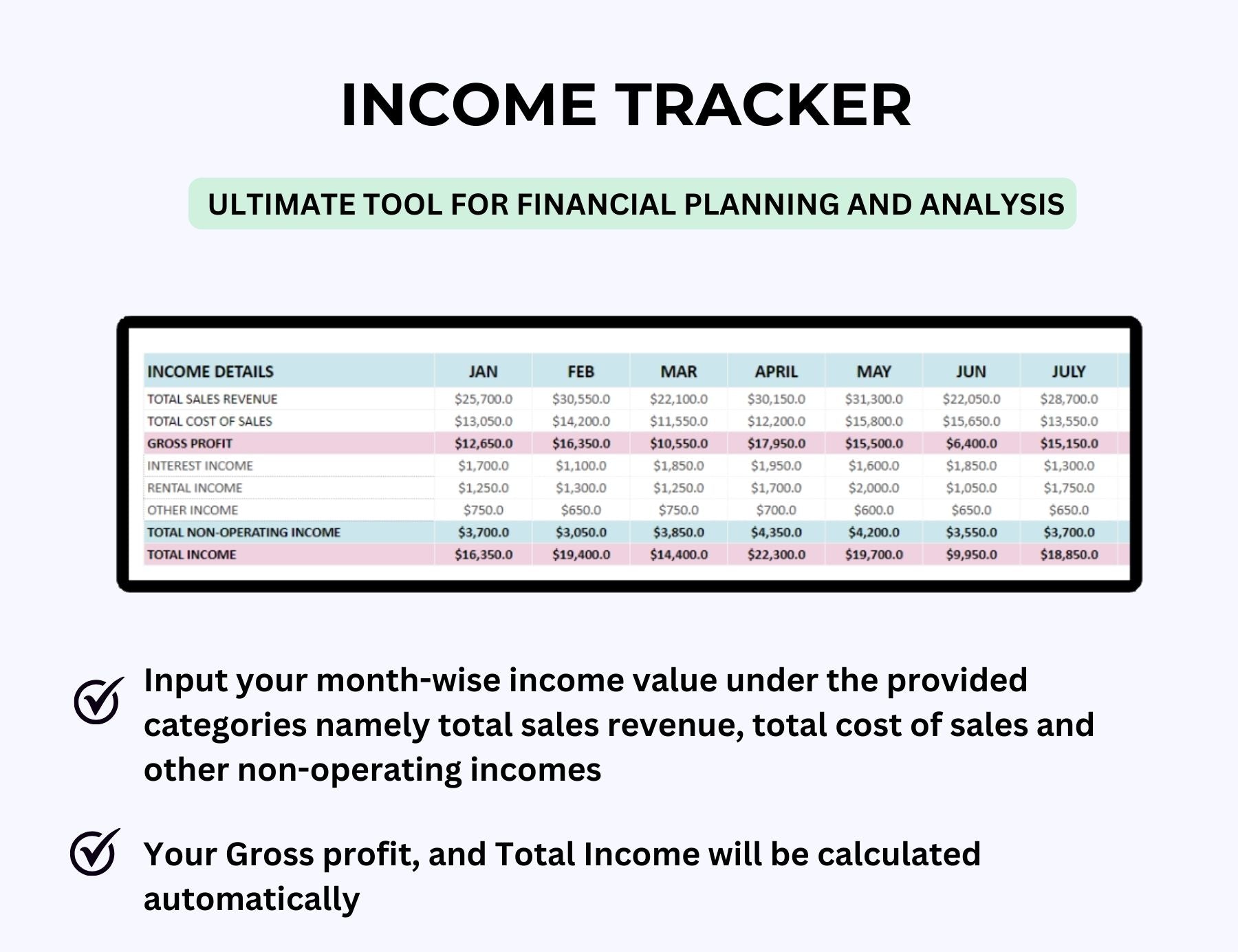 ⢠P & L STATEMENT - This tab provides you with different columns to list down your month-wise Income details, Expense details and Tax details. Automated formulas calculate your month-wise Net Income after deducting the sum total of Total Expense and Total Tax from Total income.