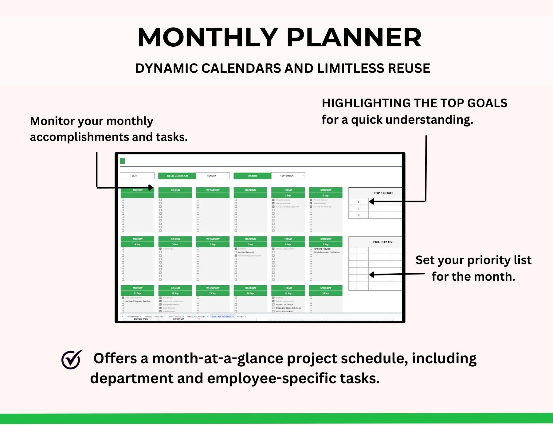 š¹ MONTHLY PLANNER : Offers a monthly overview for listing and tracking project tasks throughout the entire month, providing a comprehensive view of project planning and progress.