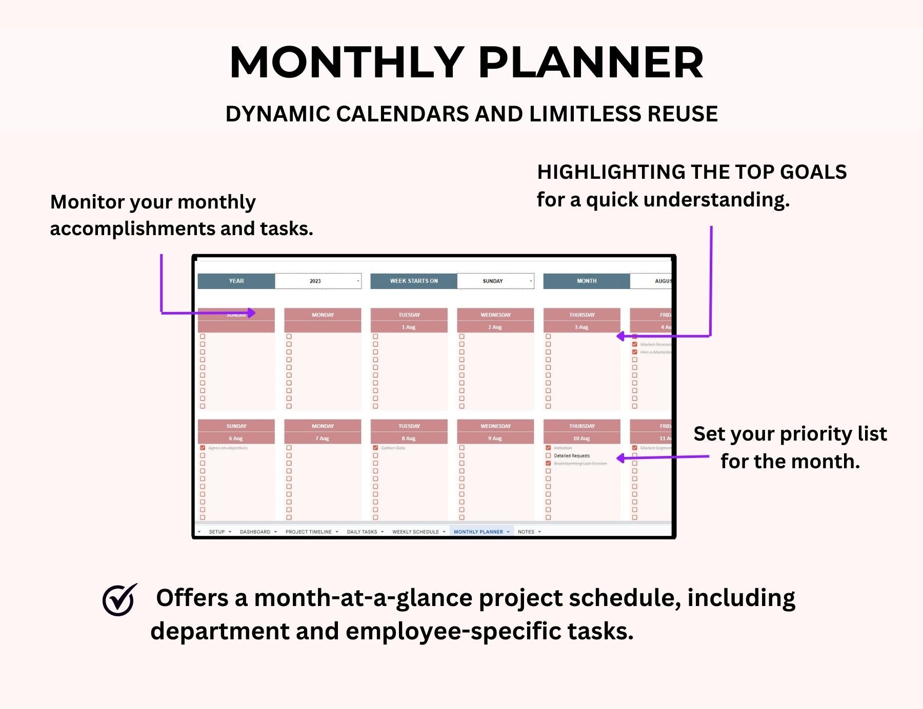 🔹 MONTHLY PLANNER : Offers a monthly overview for listing and tracking project tasks throughout the entire month, providing a comprehensive view of project planning and progress.