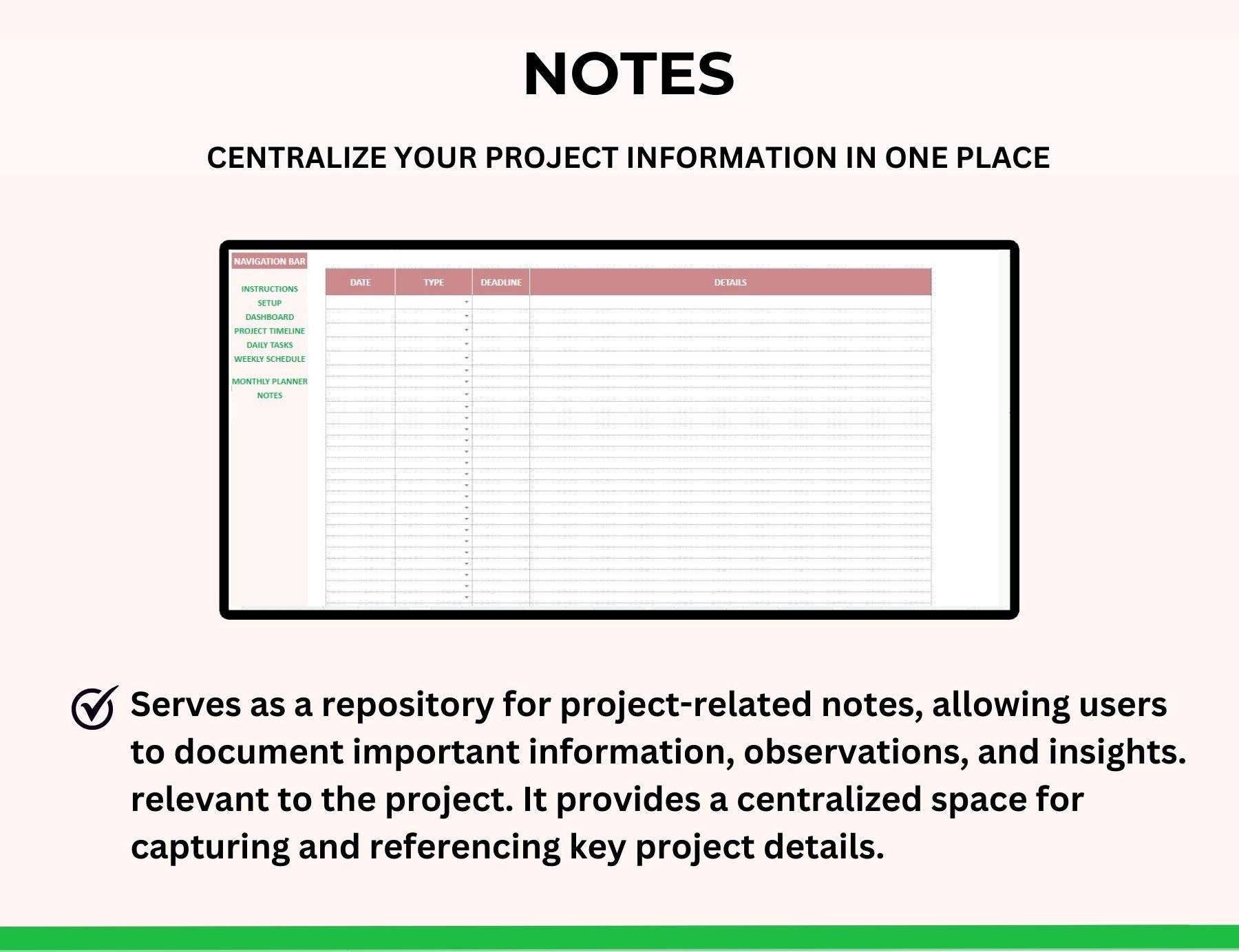 🔹 NOTES : Serves as a repository for project-related notes, allowing users to document important information, observations, and insights Relevant to the project. It provides a centralized space for capturing and referencing key project details.