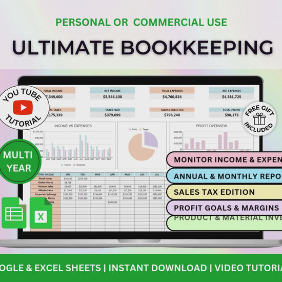 Our Ultimate Small Business Bundle is the perfect tool to help you keep track of how your business is doing. You can manage your finances by keeping an eye on your income and expenses, make sure your products are priced right, stay on top of your inventory, and keep track of your orders.